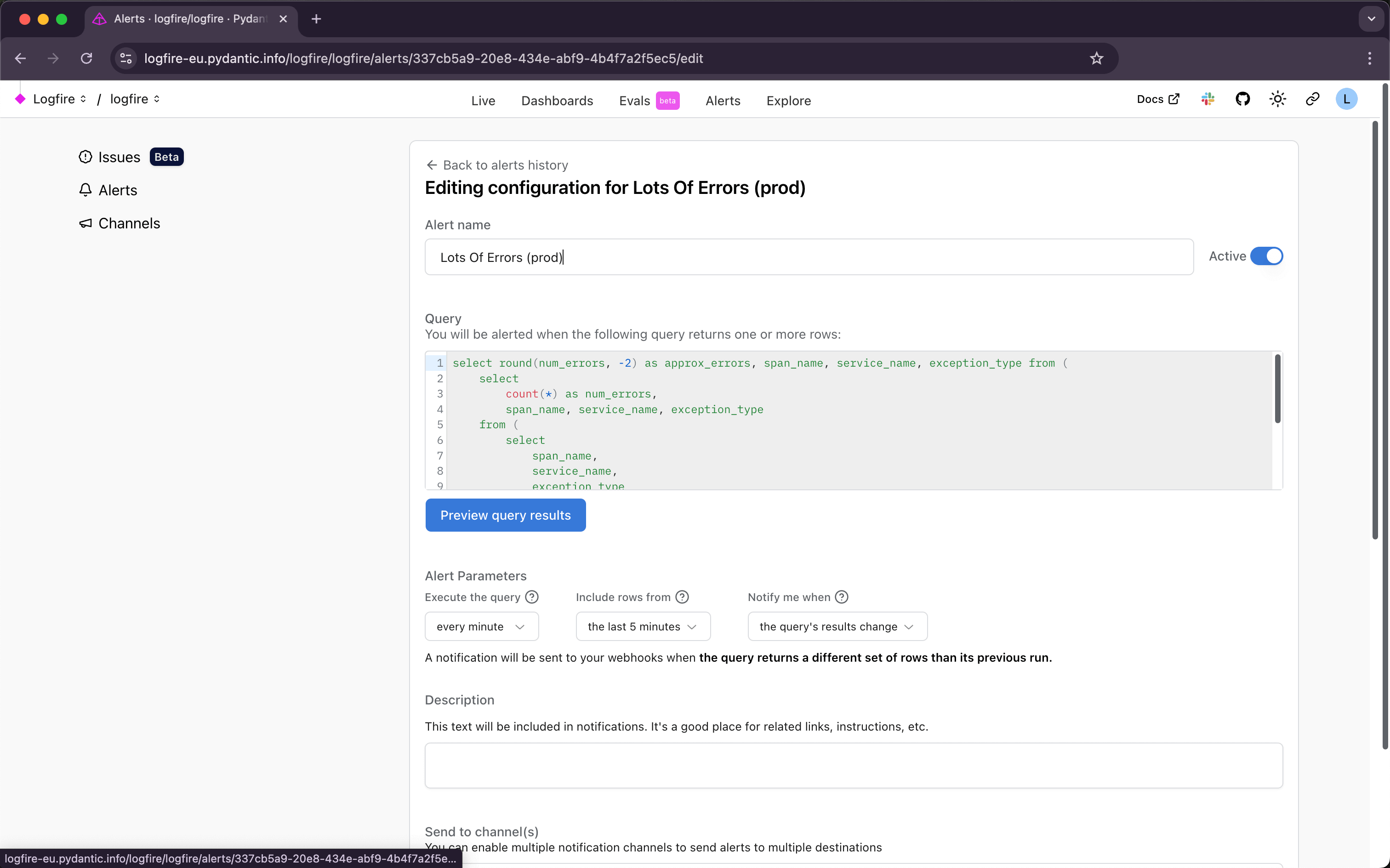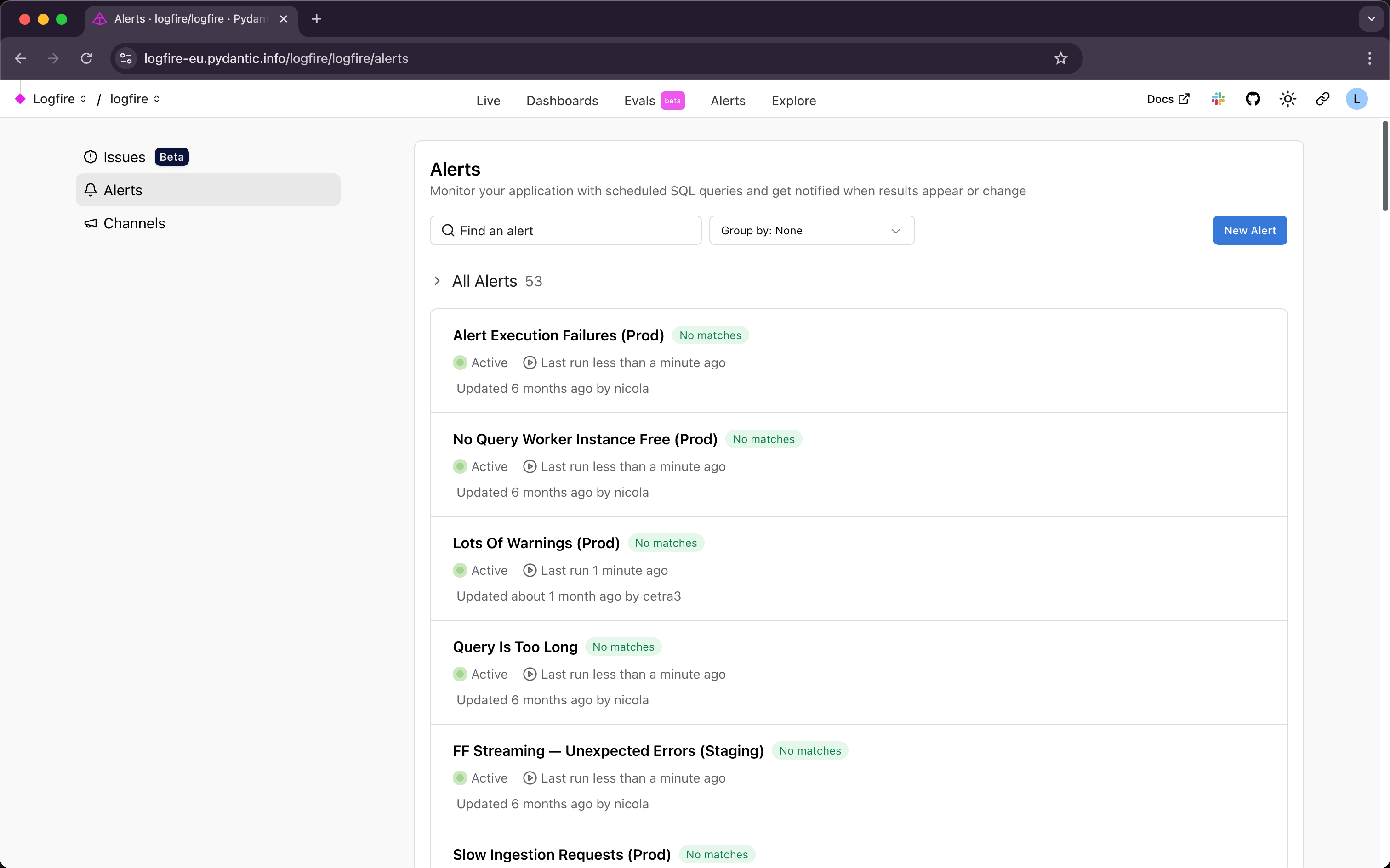 With Logfire, use Alerts to notify you when certain conditions are met.